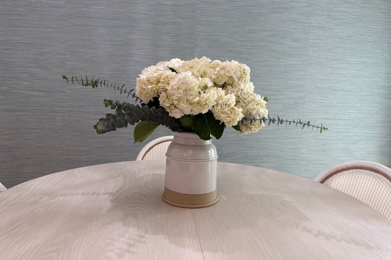 Now it’s bright, open, and perfect for relaxing with family and friends. Crisp white shaker cabinets bounce light everywhere, soft aqua island pops, gorgeous aqua-toned backsplash, sleek stainless appliances, light quartz counters, and a seamless flow into the dining room with our round table setup. Light, airy coastal perfection!