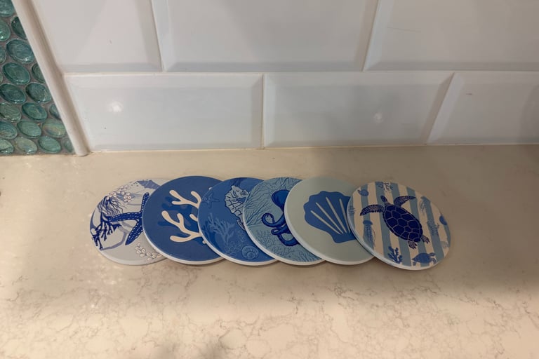 • Coasters — Set of marble or seagrass for a natural beach feel. Similar coastal marble/nautical sets: (Amazon Coasters link)