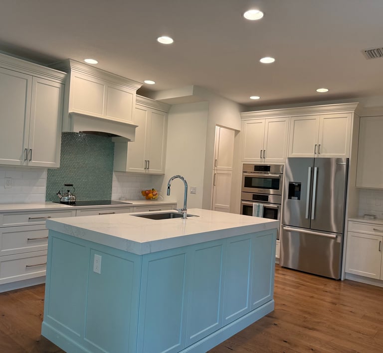 Living in Florida means loving coastal vibes, so when our old kitchen felt dark and cramped, we did a full gut renovation. We tore it down and moved plumbing and electrical. We reconfigured the whole layout for better flow and built our dream coastal space.