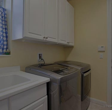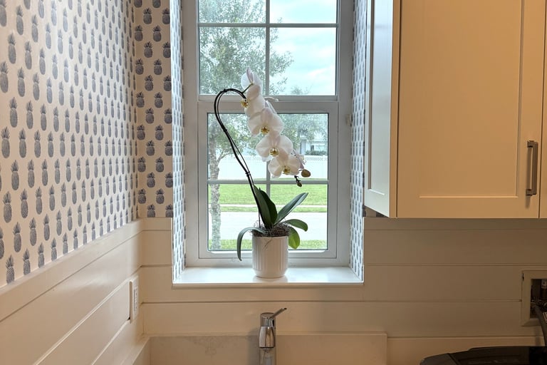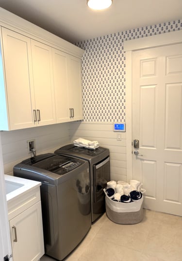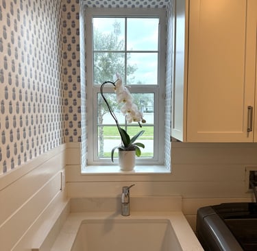 Now it’s bright, airy, and feels like a playful coastal hideaway every time I do laundry. Crisp white shiplap walls and shaker cabinets bounce natural light around the room, the blue pineapple wallpaper adds that fun tropical pop behind the machines, sandy beige tile flooring brings in warm beach vibes underfoot and the deep utility sink gleams with its modern faucet. Light, breezy coastal perfection!